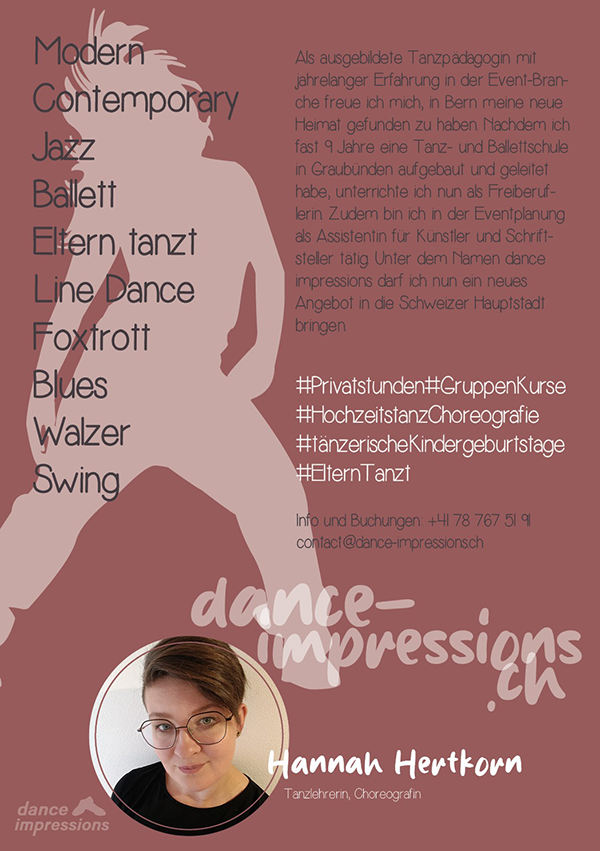 Schon seit meinem 5. Lebensjahr tanze ich klassisches Ballett, gefolgt von Jazz Dance und Modern Dance. Mit 14 Jahren begann ich bereits, meine ersten Kurse zu unterrichten. Nach meinem dreijährigen Studium zur Staatlich geprüften Lehrerin für Tanz und Tänzerische Gymnastik an der Hamburger Lola Rogge Schule arbeitete ich als freiberufliche Tanzpädagogin in und um Hamburg. 2014/2015 sammelte ich Erfahrungen als Tänzerin und Choreografin in der Schweiz sowie in Österreich. Im März 2016 wagte ich den Schritt in die Selbstständigkeit. Das Zertifikat, um integrative Gruppen mit und ohne Beeinträchtigung sowie homogene Gruppen von Beeinträchtigten jeden Alters zu unterrichten, erhielt ich im April 2017 (Gina Workshops dance institut Hamburg mit Bea Carolina Remark). Nachdem ich mehr als 8 Jahre eine kleine Tanz- und Ballettschule unter dem Namen "dance impressions Hannah Hertkorn" im schönen Unterengadin geführt habe, wurde es Zeit für eine Veränderung. Unter dem gleichen Namen bin ich seit Ende 2024 in der Stadt Bern ansässig und unterrichte, neben meiner neuen Rolle als Mama, an verschiedenen Orten.